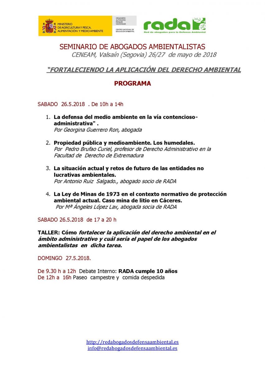 Los días 21 a 23 de Abril de 2017, RADA organiza su seminario anual “Red de Abogados para la Defensa Ambiental (RADA)”, en las instalaciones del Centro Nacional de Educación Ambiental (CENEAM) ubicadas en Valsaín, Segovia.